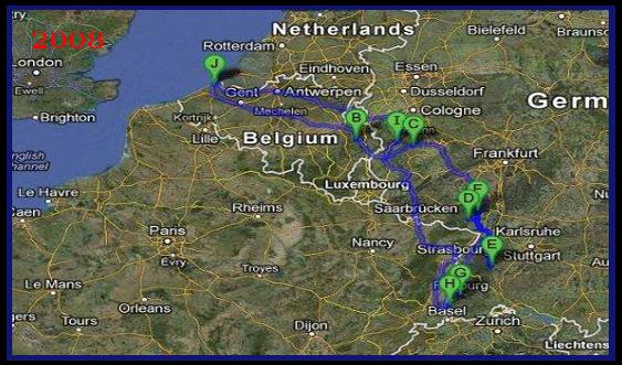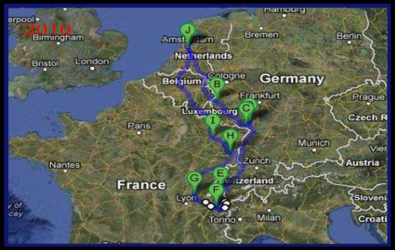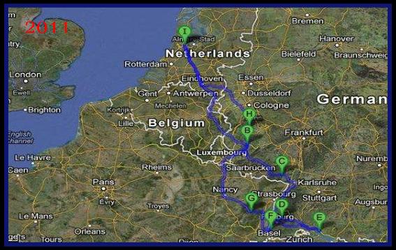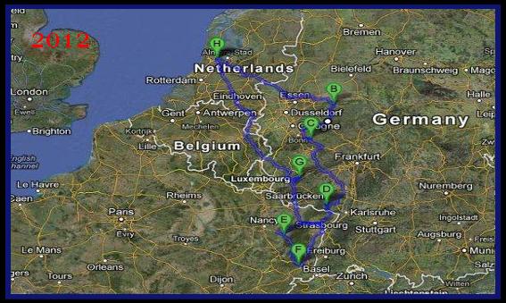 2012 Three take the Ferry from Newcastle to Amsterdam and head to Germany with the Rhein and Mossel rivers in site. Locate the start of a long road that leads to Annweiler. Weather fairly wet. And a cold wet run from Newcastle north. Accomodation :- Arnsberg, Asbach, Hauenstein, Plombiers, Thann, Morbach. (James, Dave W, Craig)