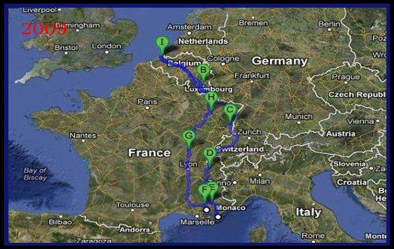 2009 St Tropez. The Goaty four return via Rosyth, Zeebrugge and make a small coffee stop in St Tropez. Most of the tour was off the beaten track on smaller roads visiting the Black Forest, Annecy, St Tropez and the Voges Mountains. Staying at :- Bastogne, Colmar, Annecy, Digne Les Bain, Forcalquier, Chalon Sur Saone, Nancy. (James, Dave S, Dave W, Craig)