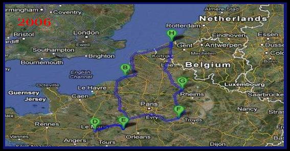 2006 Known as the Le Mans trip these famous five depart from Rosyth on the Ferry to Zeebrugge and arrange a stay near Le Mans for the MotoGP. Staying at :- Treport, Chateu Dun, Chateu Dun, Norgent sur Seine and finally Laon. (James, Dave S, Dave W, Karen and Jimmy)