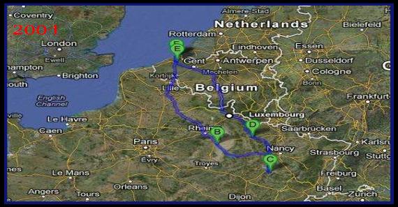 2005 The two increase to five and travel, Rosyth to Zeebrugge on the Ferry then staying :- Challon, Avallon, St Claude, Faulquemont then descend on Spa for their last night. (James, Dave S, Dave W, Karen and Jimmy)